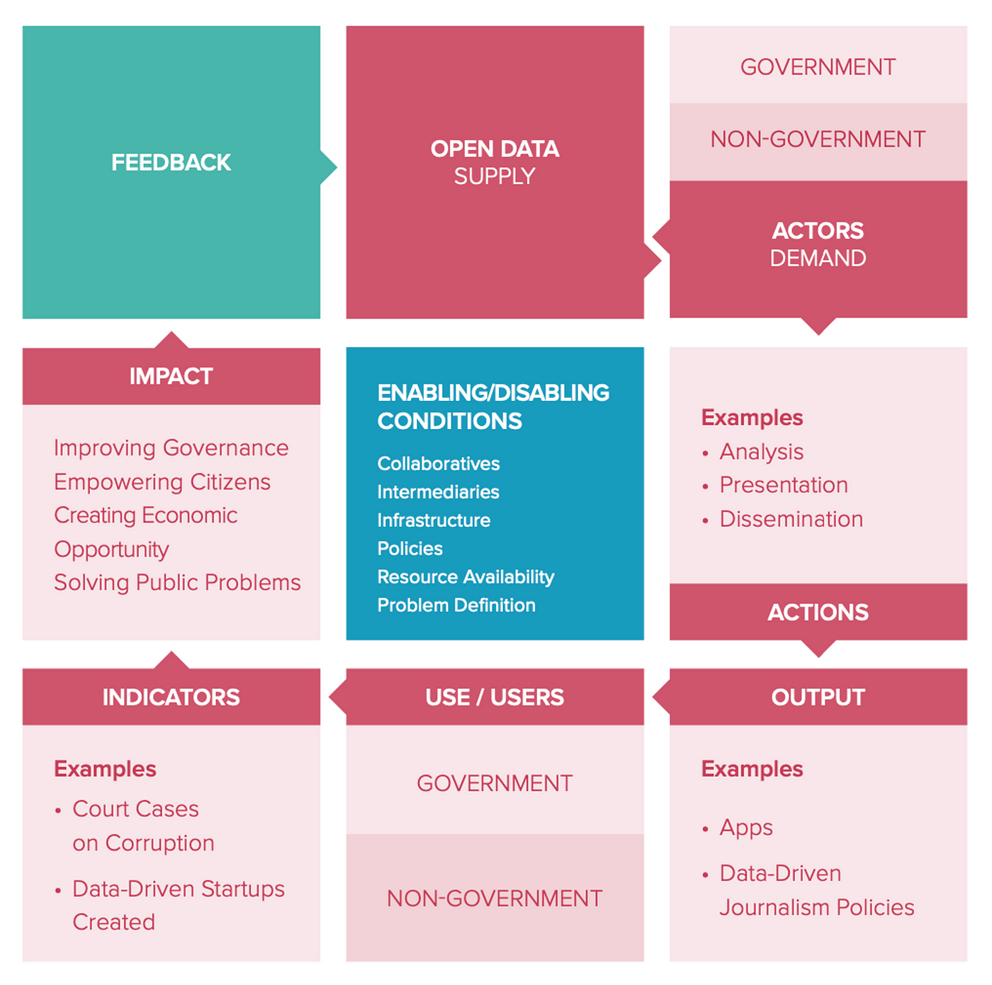 I was part of a group of scholars who started looking at how open data can help deliver impact in developing countries. One of the results of our scholarly work is a book edited by Stefan Verlhurst and Andrew Young of the GovLab — Open Data in Developing Economies. Looking at the different cases across Asia, Africa, and Latin America, the editors created the diagram below to show the journey of data from publication to impact.
