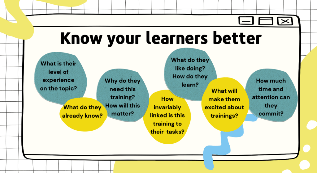 Oftentimes, learning facilitators do not care about what their participants. They go to trainings and just deliver content. But for trainings to be meaningful, they need to be suited to trainees’ needs and contexts. The good thing about training your team members, like in my case here, is that I work with them and have meaningful conversations with them over the course of the last year – providing me a glimpse of who and how they are, in such a way that answers to the questions in the graphic above come easy.