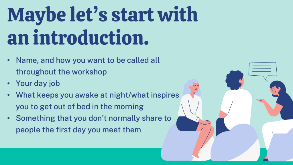 I also asked around if they had had the chance to talk more deeply about themselves and their organisations. That seemed to be not the case. Thus, I needed to do some preliminary foundational activities. So I designed three activitities for them to know each other and their respective organisations better. I used three processes here, as indicated in the slides below: