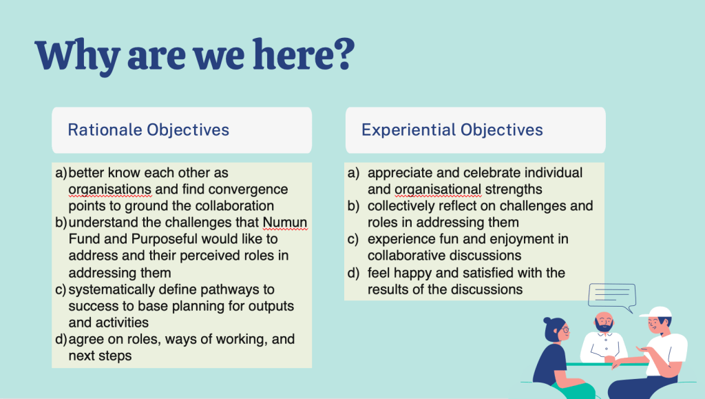 To be honest, I was not sure if the convening was able to achieve the objectives we defined at the start. Only the folks from Numun and Purposeful could say – though they did say at the end of the workshop that it was a helpful process for them. I wish them well in finalising the collaboration document that they will prepare after the workshop and hoped that what we went through over those two days helped.