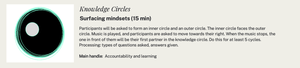 One very basic example is how I used dance and music to begin the session, interspersed with introduction and getting-to-know-you questions that would allow participants to talk to each other, something that they did less in previous sessions. One of the participants approached me right after the dancing activity, saying it was the best unfreezing activity she had experienced so far, but still replete with realisations about individual giftedness.