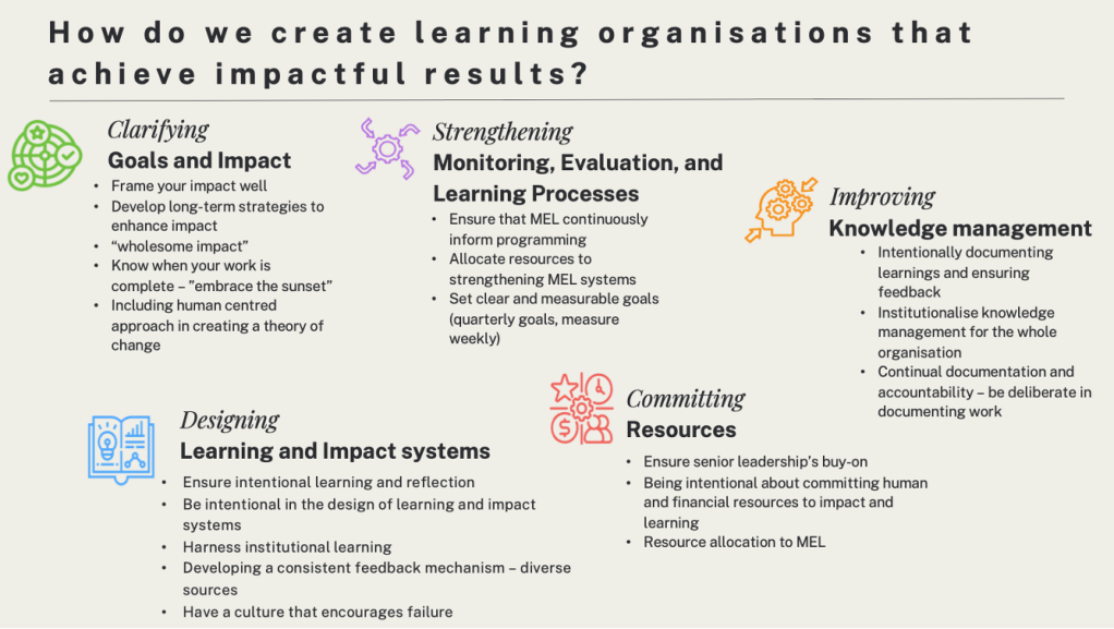 The visual above summarizes the actions we generated from the session. At the end of the workshop, I gave participants this one-pager outlining key concepts and action steps that they said they would consider to improve impact and learning practices within their organisations.