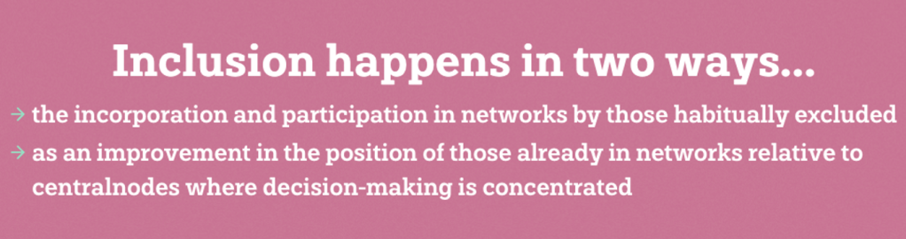 In my view, alongside Francois van Schalkwyk, good friend and collaborator, inclusion occurs through the incorporation and active participation in networks by those who are often excluded. That’s the first level. Second, we believe it is important to highlight that inclusion also takes place through improvements in the positions of those already within networks, particularly in relation to central nodes where decision-making is concentrated. The first type of inclusion I mentioned is accompanied by the recognition that, despite all our attempts and due to resource limitations, not everyone can participate at the same discussion table every time. In reality, some groups are continually underrepresented and habitually excluded, hence this preferential option, this additional focus. The second type of inclusion involves recognizing that within networks of actors, there are those who hold more power than others. So for me, what is critical and important is to ensure that those included from the peripheries due to certain endowments deficit – lack of skills, connections, political clout, among others – are able to reconfigure those power relationships and are able to advance their agenda.