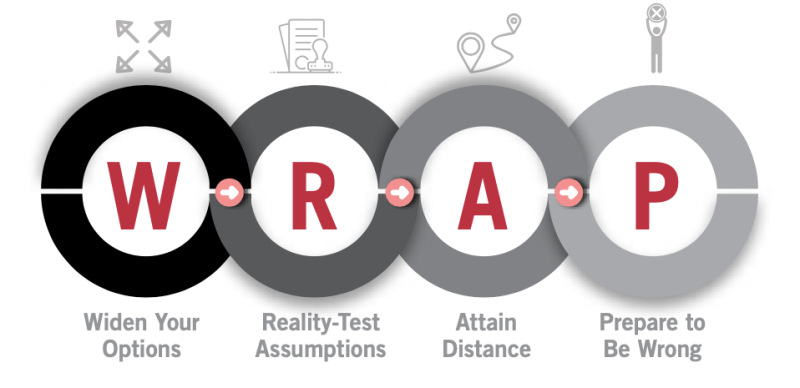 This month, I began my reading list with a re-read of the Heath brothers’ book “Decisive: How to Make Better Choices in Life and Work”. I loved their work in “Switch” and “Made to Stick”, that when this book came out in 2013, I bought two, one for me and another for a friend who was then contemplating a big decision in his life. It got mixed reviews, but I did enjoy the writing, and the mnemonics that they use to describe their suggested methods of decision-making. It’s called WRAP (The visual below comes from the blogpost from Australian leadership coach Bruce Williams).