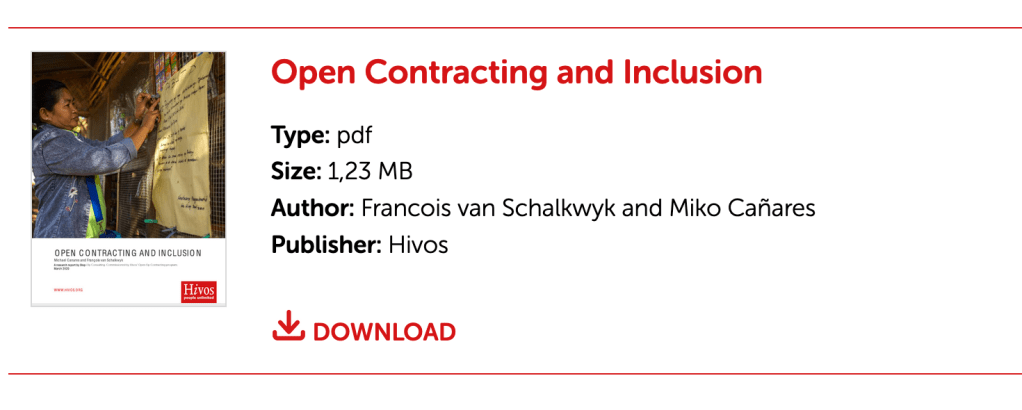 Who benefits from open contracting? In this publication (research by Francois van Schalkwyk & Miko Cañares) on open contracting and inclusion, five cases were selected to explore the possible benefits of open contracting for marginalized communities. The analytical work features cases from Indonesia, Philippines, South Africa, Nigeria, and Kenya.